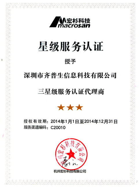 2013年12月,齊普生公司再傳喜訊:榮獲杭州宏杉科技有限公司(以下簡稱:宏杉科技)三星級服務認證代理商資格證書!